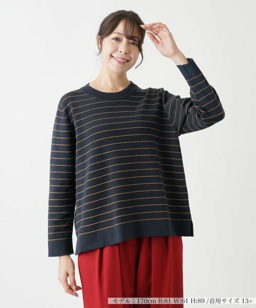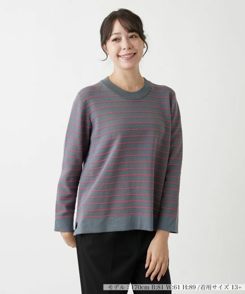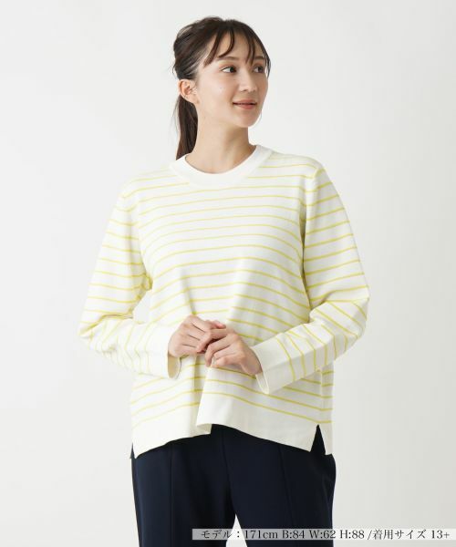 等間隔のナローボーダーが、ほんのりレトロな雰囲気を漂わせるやや薄手のクルーネックニットプルオーバー。シルエットには程よくゆとりをもたせ、リラクシーな着心地を実現しています。裾にはサイドスリットを入れて絶妙な抜け感を作り、さりげないアクセントに。シンプルなデザインで着こなしやすく、これからの季節のコーディネートの主役として活躍してくれそうなアイテムです。