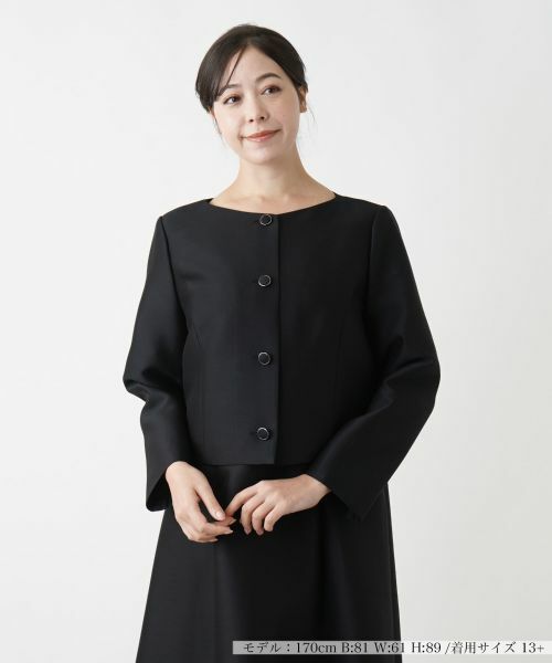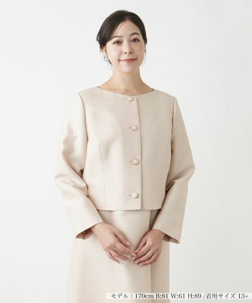 シルクブレンドのさらりとした上品な風合いの生地を用い、巧妙なパターンメイクでデザインされたノーカラージャケット。ゆったりと開いたネックラインは、大人の女性らしいヘルシーなデコルテを美しく引き立て、控えめながらも魅力的な印象を演出。前立てのボタンがさりげなく、上品で華やかなアクセントを加えます。オフィスから週末のお出かけまで幅広いシーンで活躍する一着。セットアップにも対応します。
