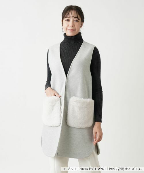 洗練されたデザインながらも大きなポケットがアクセントとなり、トレンド感のあるレイヤードスタイルが叶うベスト。ポケット部分には柔らかいフェイクファー素材が使われており、見た目にも温かみを感じさせます。どんなアイテムにも合わせやすく、上品で落ち着いた印象を演出します。コーディネートは、インナーにタートルネックを合わせたり、パンツスタイルで縦のラインを強調することで、スッキリとしたシルエットに仕上がります。シンプルなデザインだからこそ、アクセサリーや小物で個性をプラスしやすく、秋冬のデイリーに活躍します。フロントホックで開閉可能です。