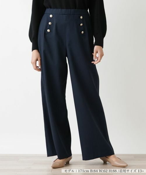 いつものスタイリングが爽やかなフレンチスタイルにアップデートされるマリンルックなワイドパンツ。ウエスト後ろはゴムになっている為、イージーに着用出来る気軽さも嬉しいポイント。さらりとした素材感で、オフィスなどきっちりとしたシーンでも着用いただける綺麗目な仕立てになっています。腰位置が高く、太めのウエストラインで、スタイルアップも叶う一本です。フロントは飾りボタンで、サイドファスナーで開閉が可能です。