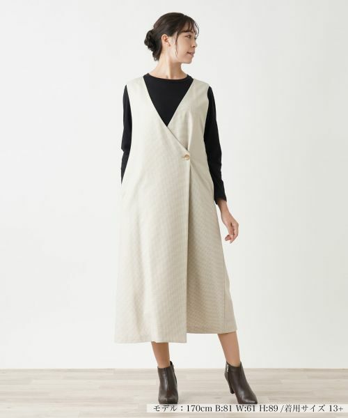 すっきりとしたシルエットかつ、シンプルでエレガントなVネックのロングジャンパースカートです。インナーに合わせるトップス次第でカジュアルにもフォーマルにも着こなせる、多用途な一着です。シンプルながらも洗練されたデザインで、上品な雰囲気を演出します。家庭洗濯不可漂白不可タンブル乾燥不可アイロン低温160℃まで石油系溶剤ドライクリーニング弱ウェットクリーニング不可