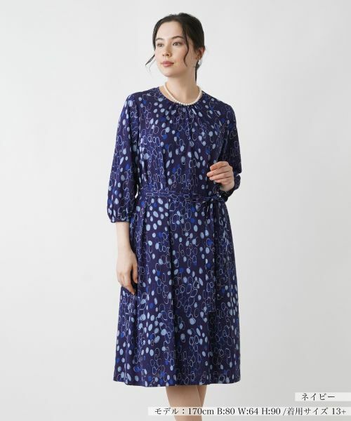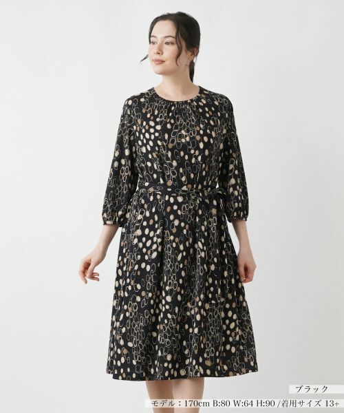 全体にオプティカルな柄をプリントしたボリュームスリーブのフレアワンピース。すっきりと開いたネックラインがデコルテを美しく引き立てます。さらりとした薄手の生地を使用しており、ふわりとしたスリーブラインがトレンドライクな表情を生み出します。表面には自然なドレープ感があり、柔らかなニュアンスに仕上がります。ハイウエストで共布ベルトをマークすればメリハリの効いたスタイルが完成します。バックファスナーで開閉が可能です。
