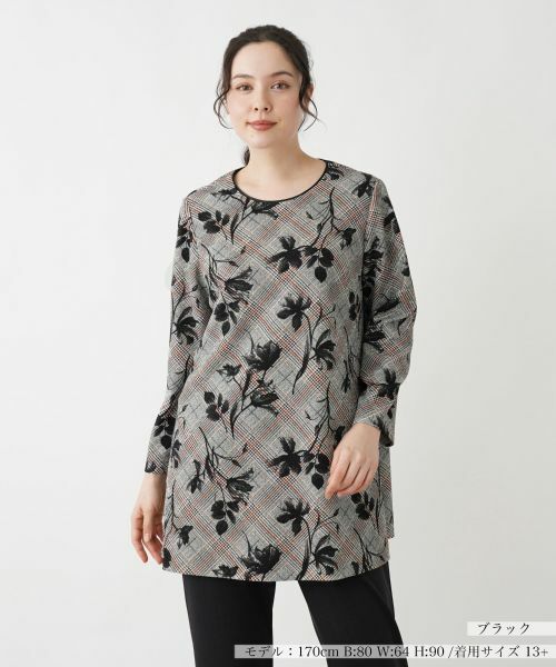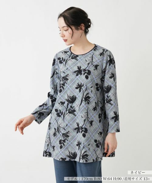 クラシカルなグレンチェックをベースに、ボタニカル柄を重ねたユニークで洗練されたデザインが魅力のチュニックブラウス。身体のラインを拾いにくいリラックスしたシルエットとヒップまでカバーする丈感が、体型を気にせずナチュラルな印象を演出してくれます。バックスナップボタン&ファスナー仕様で着脱もスムーズ。デザイン性と機能性を兼ね備えたブラウスは、デイリーから週末のお出かけまで多彩なコーディネートで幅広く活躍します。