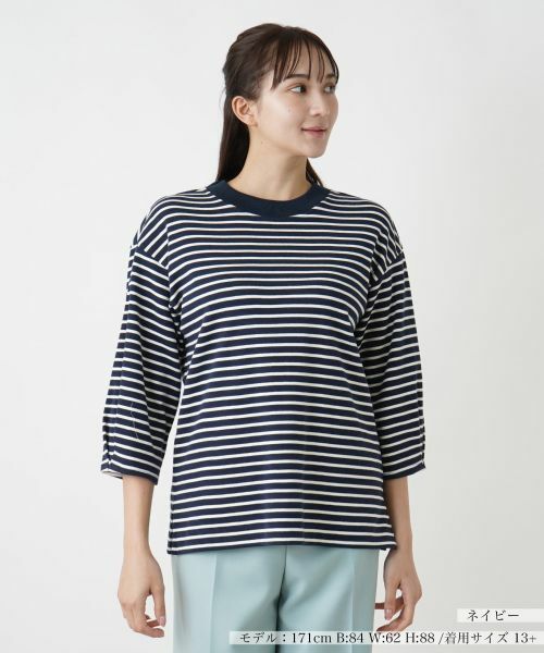 等間隔のマリンボーダーが爽やかな雰囲気を漂わせるハイネックカットソー。ゆったりとしたドロップショルダーとクロップドスリーブで絶妙な抜け感を作り、上級者らしいこなれたスタイリングが叶います。一枚での着こなしはもちろん、ジャケットやコートとのレイヤードでも活躍。ボトムスはカジュアルなワイドパンツから、フェミニンなロングスカートまで多彩なアイテムと合わせやすくなっています。