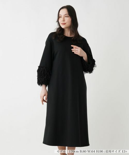シンプルながらも袖のデザインが特徴的なミディ丈のワンピースです。柔らかなベージュカラーが落ち着いた印象を与え、上品で女性らしいスタイルを演出します。袖口にはふんわりとしたファーのようなテクスチャーが施され、華やかさと遊び心をプラス。リラックス感のあるゆったりとしたシルエットで、動きやすく快適な着心地です。デイリー使いはもちろん、ちょっとしたお出かけやリラックスしたシーンにも最適な一着です。【サイズ表記について】