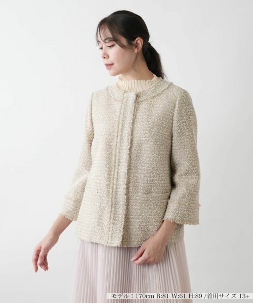ラメが繊細に煌めくツィーディーな生地で仕立てられた、上品かつ華やかなノーカラージャケット。すっきりとしたネックデザインが顔周りを上品に引き立て、シンプルながらも洗練された印象を与える一着です。フロントは比翼仕立てで、スナップボタンを採用。開閉がスムーズで実用的でありながら、余計な装飾を省いたミニマルさが全体の洗練された雰囲気を際立たせます。前ウエスト両サイドにはシンプルなポケットをレイアウト。ベーシックなパンツを合わせてシックにまとめるのはもちろん、スカートやワンピースと合わせれば、フェミニンでエレガントなスタイリングが楽しめます。