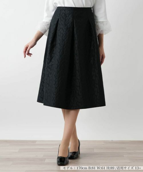 レオパード柄が印象的なミディアム丈のフレアスカート。控えめな柄使いながらも、奥行きのある表情が洗練されたニュアンスをプラス。ウエストは程よくシェイプされ、裾に向かって緩やかに広がる美しいシルエットが、女性らしい柔らかなラインを描き出します。前後にタックを施し、動きに合わせて軽やかな立体感を生み出します。ウエスト部分には適度な伸縮性を持たせており、長時間の着用でもストレスなく快適なはき心地を実現します。サイドホック&ファスナーにより開閉が可能。