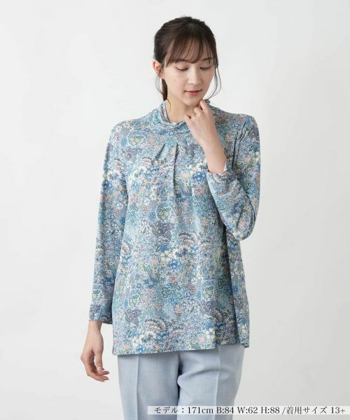 エキゾチックなボタニカル柄をプリントしたハイネックカットソー。ネック部分には柔らかなドレープ感を持たせ、さらに放射状に施されたタックが繊細な表情を生み出しています。柔らかなレーヨンベースの生地で肌当たりもよく、ヒップまで隠れる程よい丈感が気になる部分をさりげなくカバーしながら、全体のシルエットをナチュラルに仕上げてくれるのも嬉しいポイント。シンプルなボトムスを合わせるだけで旬のコーディネートが完成する便利なアイテムです。