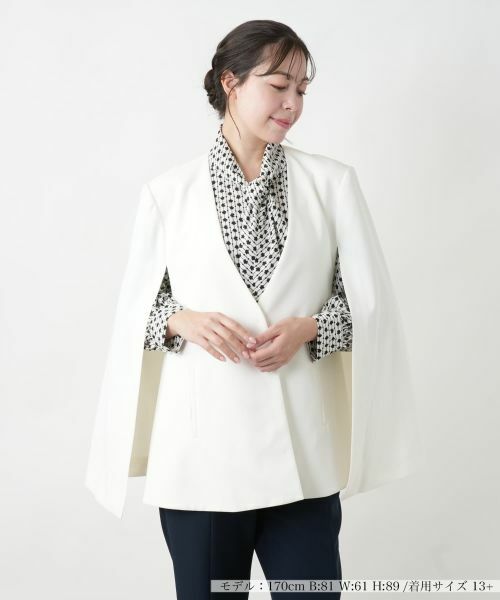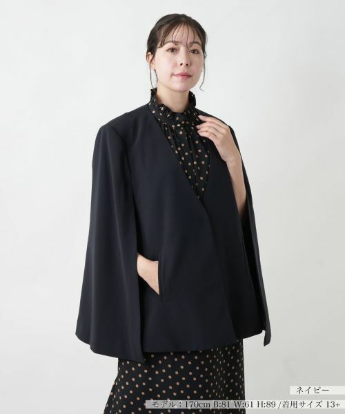 流れるようなシルエットがクリーンでマニッシュな雰囲気のケープ風ジャケット。袖部分が大きく開いたデザインで、ジャケットのきちんと感に程よい抜け感をプラス。フロントはシンプルなノーカラー&Vネックで、すっきりとした印象に仕上げました。ショルダーからバックにかけてケープを羽織ったような切替えが目を引く、華やかさのある美しいデザイン。パンツやワンピースとも相性が良く、上品見えするアイテムなのでお呼ばれシーンにもぴったり。羽織るだけで洗練されたムードを演出する一着です。