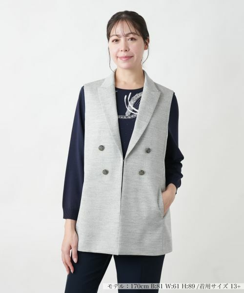アンティーク調の釦がアクセントのマニッシュなジレ。ダブルに見せかけた突き合わせデザインなので重くならずすっきりとした着こなしに。