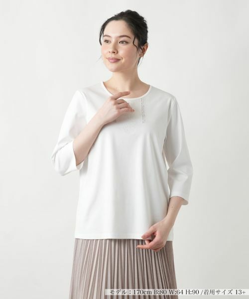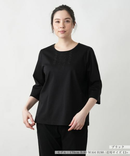 シックで落ち着いた色合いが大人の雰囲気を醸し出す七分袖カットソー。フロントにはアンティーク調のレース刺繍を施し、シンプルながらもさりげないアクセントをプラス。程よくフィットするすっきりとしたシルエットが、身体のラインを美しく見せつつ、動きやすさもキープ。ジャケットやコートのインナーとしても映えるデザインでロングシーズン活躍します。パンツと合わせてクールに、スカートとコーディネートしてフェミニンにと、スタイリングの幅が広がりそうです。