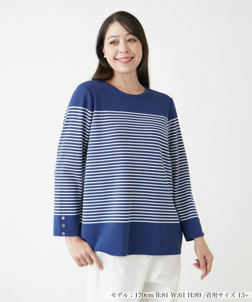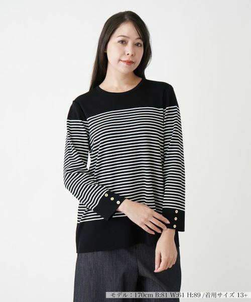 爽やかなマリンボーダーが目を惹くニットトップス。上品さとカジュアルさが絶妙に調和したデザインで、袖口にはヴィンテージライクなボタンがアクセントとして施され、ディテールにもこだわりが光ります。ゆったりとしたシルエットが動きやすさと快適な着心地を実現し、リラックス感のあるスタイリングが楽しめます。シンプルながらも洗練された印象を与え、デニムやスカートとの相性も抜群。デイリールックはもちろん、少しおしゃれを意識したシーンでも活躍します。