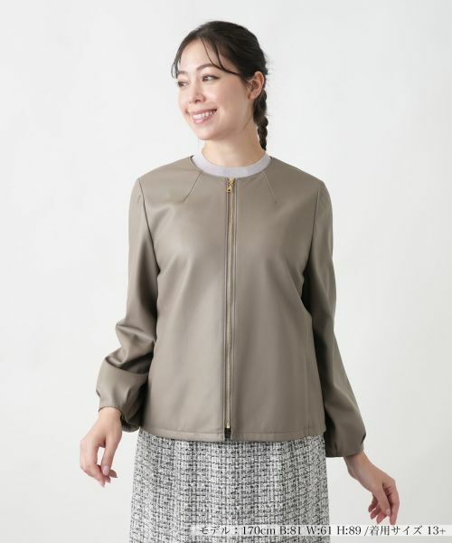 滑らかな肌触りが特徴の高品質な合成皮革を使用したノーカラージャケット。ミニマルなデザインが洗練された印象を与え、大人の女性らしい上品でモダンなスタイルを演出。すっきりとしたシルエットが身体のラインを美しく引き立て、羽織るだけで洗練された佇まいに仕上げてくれる一着です。フロント部分にはファスナーを採用し、スムーズな着脱を実現。ノーカラーのデザインは、首元をすっきりと見せつつ、インナー次第で様々なコーディネートが楽しめるのが魅力。ワンピースやロングスカートとのミックス感のあるコーディネートもおすすめです。