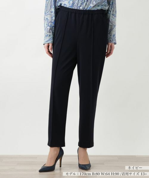 レッグラインをスマートに引き立て、シャープな印象を与えてくれるテーパードパンツ。美しい細身のラインを強調するセンターシームが、すっきりとしたシルエットを演出。ウエストには程よい伸縮性をもたせ、快適なはき心地を実現しています。動きやすさを考慮したストレッチ素材を使用しており、足捌きもスムーズで長時間の着用でもストレスフリーに過ごせます。ブラウスやニットと合わせてオフィスカジュアルに、Tシャツやスニーカーと合わせてリラックスした大人のデイリースタイルにと、幅広いスタイリングに対応します。