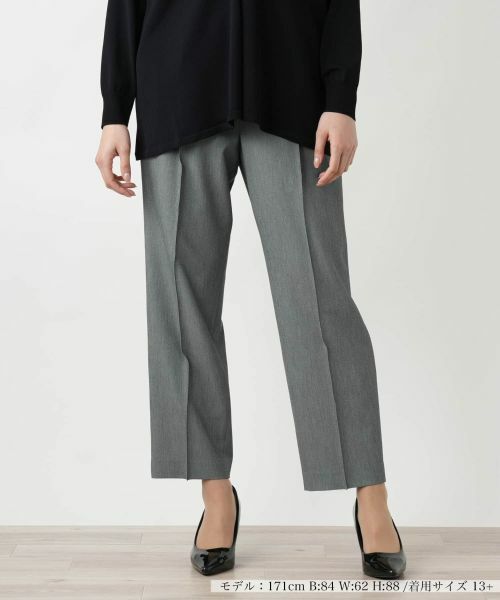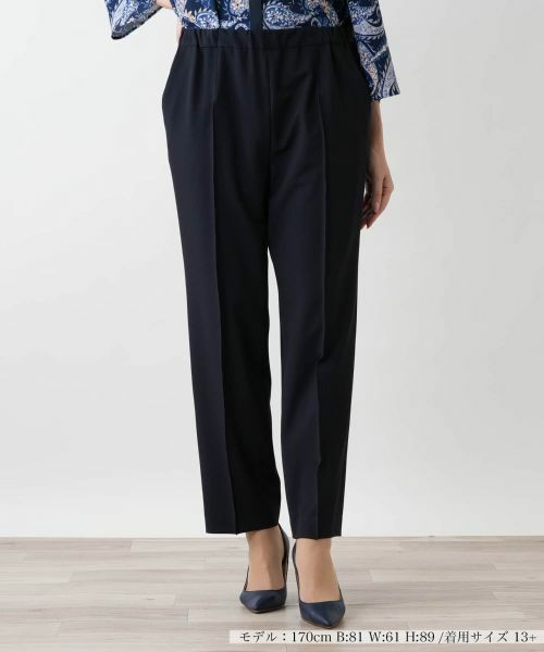 洗練されたデザインの中に、さりげないモダンさを漂わせるテーパードパンツ。フロントにはセンターシームを施し、視覚的な縦ラインが脚を長く見せる効果を発揮。裾に向かって緩やかに絞り込まれたシルエットが、レッグラインを美しく引き立て、スタイリッシュな印象を与えます。バックウエストはゴム仕様になっており、ストレッチ性のある生地を採用しているため、動きやすさと快適な着心地を両立。オフィスでの長時間の着用や、アクティブなシーンでも窮屈さを感じさせません。オンオフ問わず活躍するシンプルなアイテムは、ブラウスやカットソーとの相性が抜群。