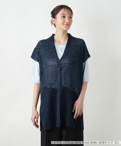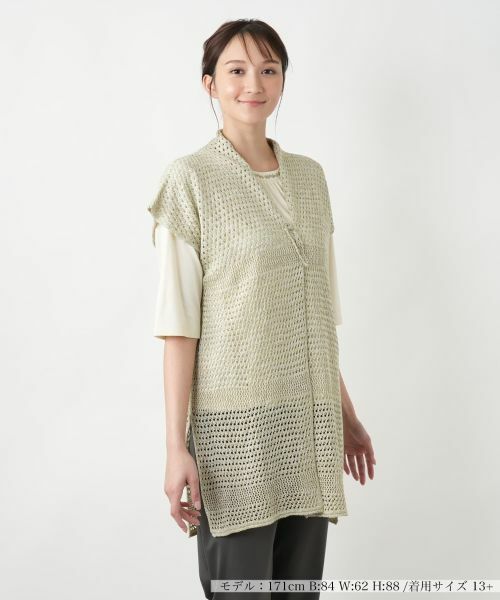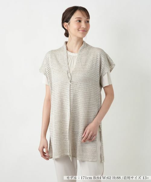 全体にラメが煌めき、エレガントな印象を与えるセミロング丈のニットベスト。繊細な透かし編みが施され、季節らしい涼やかな着心地を実感できる一枚。フロントはピン留めでさっと留めるだけでこなれたスタイリングに仕上がるのもポイント。裾には深めのサイドスリットを入れて動きのあるニュアンスと抜け感をプラス。シンプルなカットソーやワンピースの上にさらりと羽織るだけで、大人のレイヤードスタイルが完成するアイテムです。