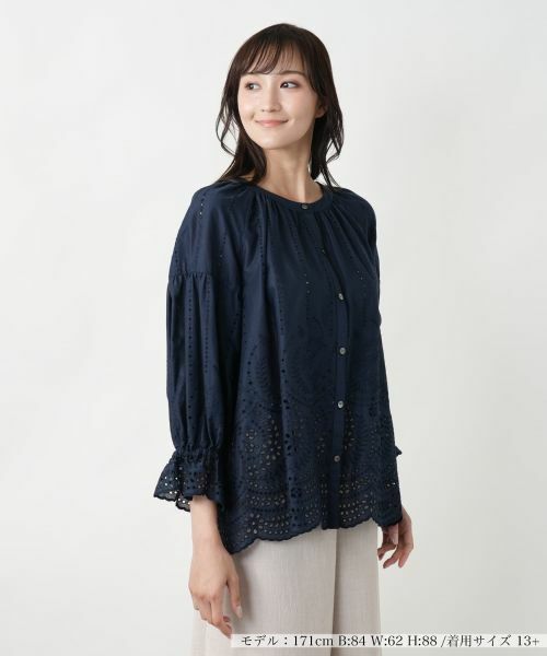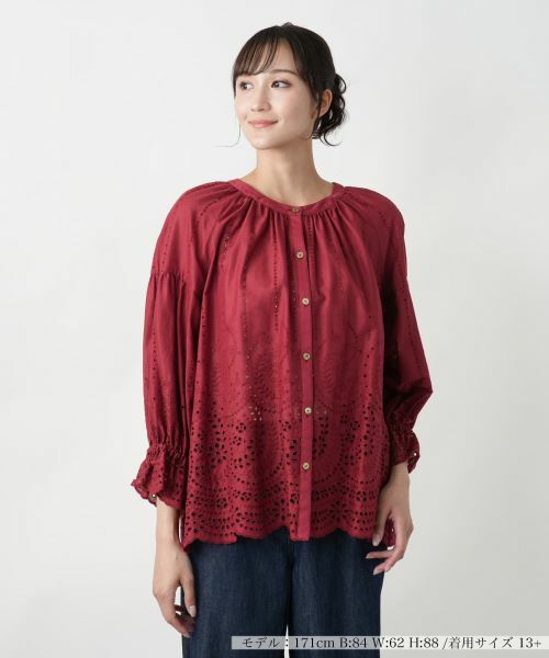 繊細なスカラップレースが目を惹く、バンドカラーブラウス。ボリュームのある袖や身頃に、たっぷりと寄せたギャザーが広がり、フェミニンな柔らかさを引き立てます。袖口はゴム入りのシャーリングで心地よくフィット。パンツスタイルに合わせれば軽やかなカジュアルに、ミモレスカートでまとめてフェミニンな装いに。一枚で着映えしながらも、幅広いスタイリングに溶け込むアイテムです。