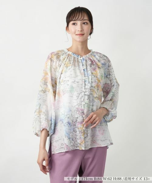 世界地図のプリントが淡くにじむ水彩のような色合いで描かれた、アンティーク調のブラウス。ネック周りにはフリルをあしらい、ほんのり甘いエッセンスに。軽やかなクロップドスリーブやふんわり膨らみをもたせたシルエットがエアリーなスタイリングを演出。フロントにはループボタンを採用し、細部までさりげないこだわりをプラス。袖口はゴム仕様で心地よくフィット。さらりと肌に心地よいコットン素材を使用しているのでこれからのシーズンにぴったりです。