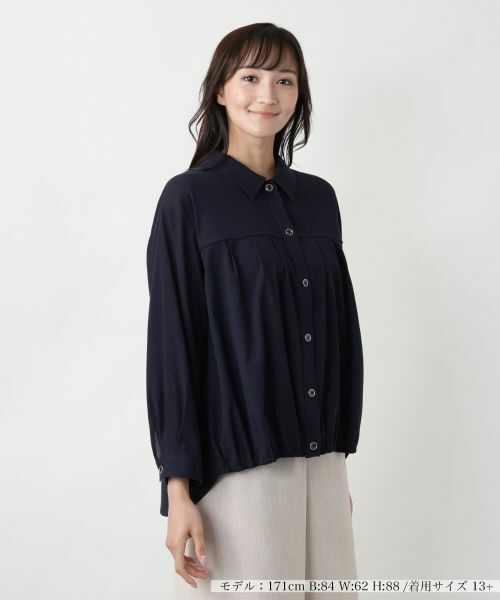 繊細さとリラクシーさを兼ね備えた、涼やかに羽織れる襟付きブラウス。ゆったりと落ちるドロップショルダーや前後に施したタックが生み出すエアリーなシルエットが魅力。肩の力を抜いたナチュラルな着心地でありながら、顔まわりを引き締める端正な襟元が、装いにきちんと感を添えてくれます。ボタンはほんのり光沢を放つ貝調ボタンをセレクト。さりげないアクセントとして、控えめながらも上品なニュアンスを添えています。生地には伸縮性があり、前裾のみゴムが施されています。
