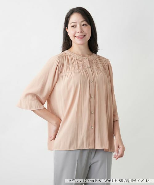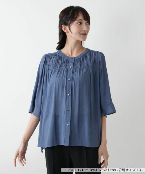 たっぷりと寄せたギャザーが、やわらかな陰影を描き出すブラウス。ふんわりと広がるスリーブが風をはらみ、軽快な季節感を演出。さらに後ろ裾を長めに設計したシルエットが、動くたびにニュアンスのある表情を生み出します。メタリックな光沢を放つボタンがさりげないアクセントに。シンプルなカラーリングでボトムスを選ばずにコーディネートしやすく、オンにもオフにも寄り添う着回し力の高い一枚です。