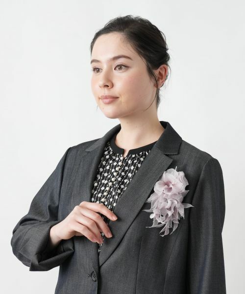 シルクオーガンジーやサテン素材を使用したフラワーモチーフのコサージュ。繊細で軽やかな素材がふわりとした立体感を生み出し、上品で優雅な雰囲気を演出。控えめながらも上品に輝くビジューをあしらい、さりげない華やかさをプラス。添えるだけでシンプルな装いにもエレガントなアクセントを加えてくれます。結婚式やパーティーなどの特別なシーンにふさわしく、定番のドレススタイルを一層引き立てる、洗練されたアクセサリーです。安全ピン留め。