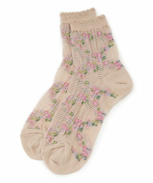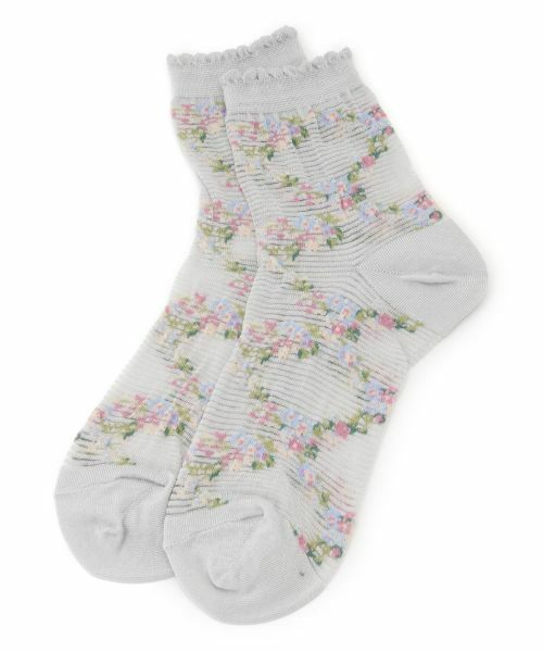 足元をさりげなく彩る、華やかな小花柄のショートソックス。シアーボーダーニットが軽やかで、これからの季節にぴったりの涼しげな印象を演出。履き口には繊細なフリルをあしらい、ほんのりフェミニンな甘さをプラス。カジュアルなデイリースタイルにはもちろん、エレガントな大人のコーディネートにも優しくマッチ。スニーカーやフラットシューズと合わせて、ひと味違ったアクセントを楽しめる一足です。