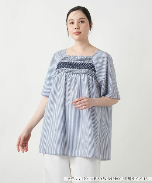 爽やかなテイストのストライプが彩るチュニックブラウス。スクエアネックから覗くデコルテが絶妙な軽やかさと抜け感を演出します。胸元には繊細なエスニック調のシャーリング刺繍をあしらい、ナチュラルな中にもほんのりとしたアクセントをプラスしました。たっぷりとギャザーを入れた身頃は、ふんわりと広がる立体感のあるシルエットを構築。リラックスした着心地ながらも、これからの季節のスタイリングに華を添えるトップスです。バックネックの涙あきはボタン開閉が可能。