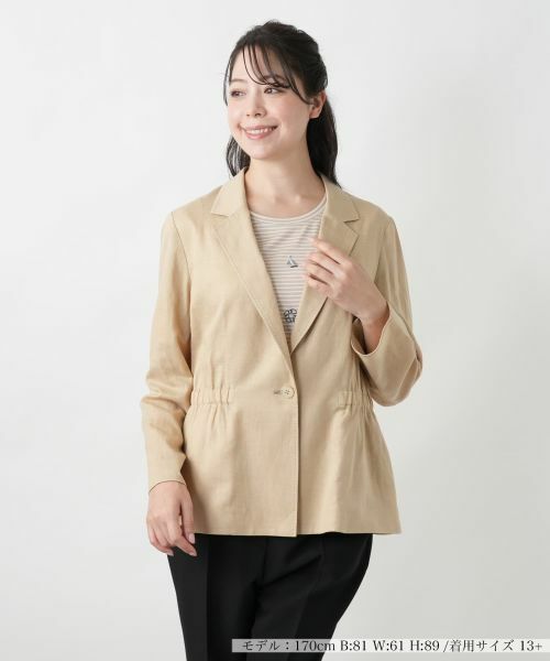 さらりとした薄手の軽やかな素材感がシーズンらしさを感じさせる、テーラードジャケット。端正なカラー&ラペルがきちんと感をもたらし、スマートで洗練された印象へと導きます。ウエスト部分にはゴムシャーリングを施してくしゅっとさせ、締め付け感なくフィット。女性らしい立体感のあるシルエットを描きながらも、快適な着心地をキープします。前ウエスト両サイドにはシンプルなスリットポケットをバランスよくレイアウト。オンにもオフにもフレキシブルに活躍してくれそうな一着です。