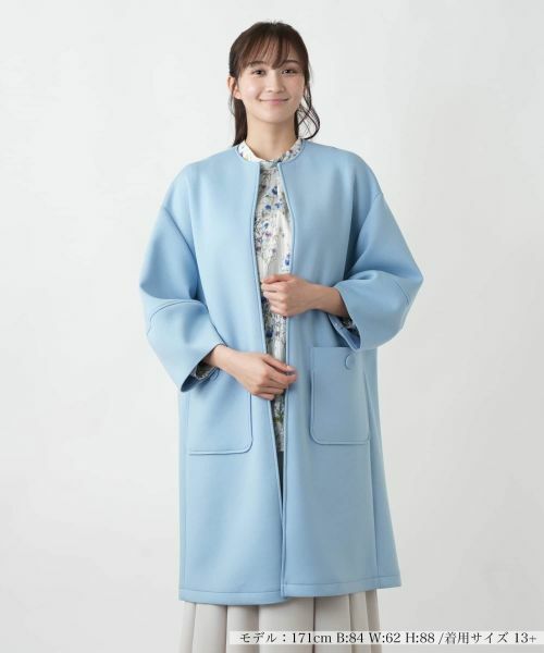 すっきりとしたノーカラーデザインが洗練された印象のノーカラーコート。程よくゆとりのあるシルエットが、インナーを選ばず重ね着しやすい一枚です。袖には切り替えを入れ、立体感のあるボリュームスリーブに仕上げました。大きめのポケットとボタンがアクセントになり、機能性も兼ね備えています。首元はホックで開閉ができ、さらりと羽織るだけでこなれた雰囲気を演出し、カジュアルからきれいめまで幅広いスタイリングに対応。軽やかな素材感で、これからの季節に活躍してくれるアウターです。