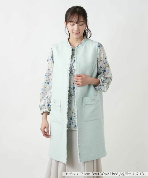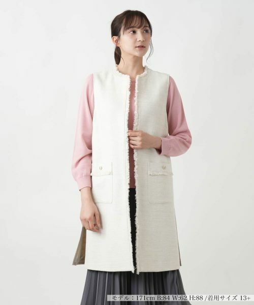 軽やかな着心地と洗練されたデザインが魅力のロングジレ。すっきりとしたシルエットに、端をさりげなくあしらったフリンジがアクセントを添え、大人のこなれた印象を演出します。フロントはボタンレスのシンプルなデザインで、さっと羽織るだけでスタイリングに奥行きをプラス。ブラウスやカットソーの上に重ねるだけで旬のレイヤードスタイルが完成します。ワイドパンツやタイトスカートとの相性も良く、オンオフ問わず活躍する一枚です。
