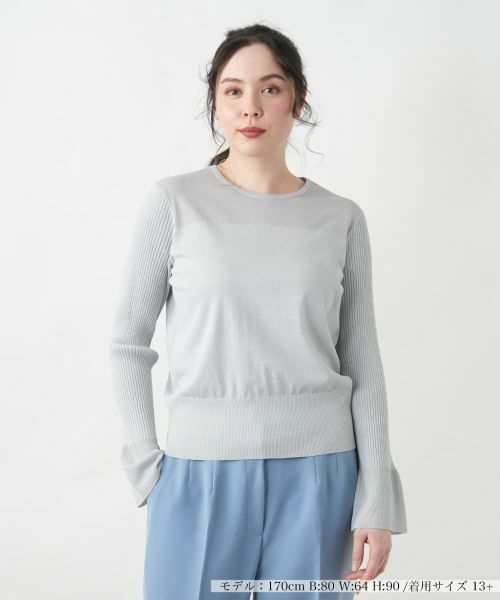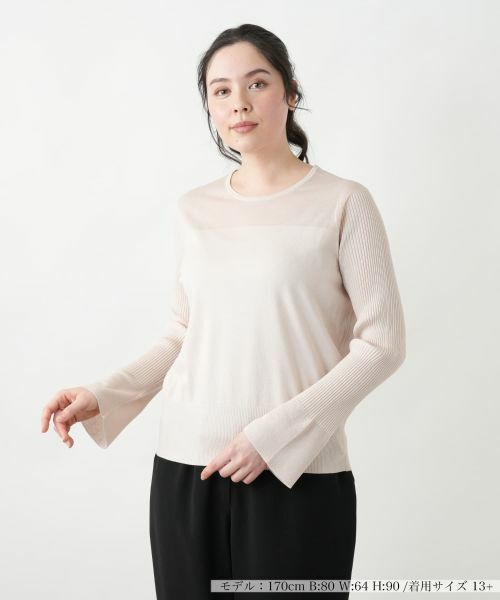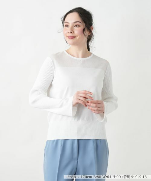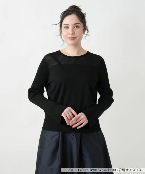 上品な透け感が魅力のシアー切替プルオーバー。デコルテ部分にさりげない透け感を取り入れることで、女性らしい洗練された印象をプラスしました。ボディは程よいフィット感のあるシンプルなデザインで、スタイルアップ見せを叶えつつ快適な着心地を実現。スリーブはリブ編みからの袖口はフレアシルエットになっており、手元をエレガントに演出します。シンプルながらも細やかなディテールにこだわった一枚は、スカートやデニムと合わせたカジュアルスタイルはもちろん、ジャケットのインナーとしても活躍します。
