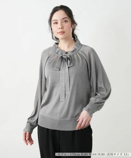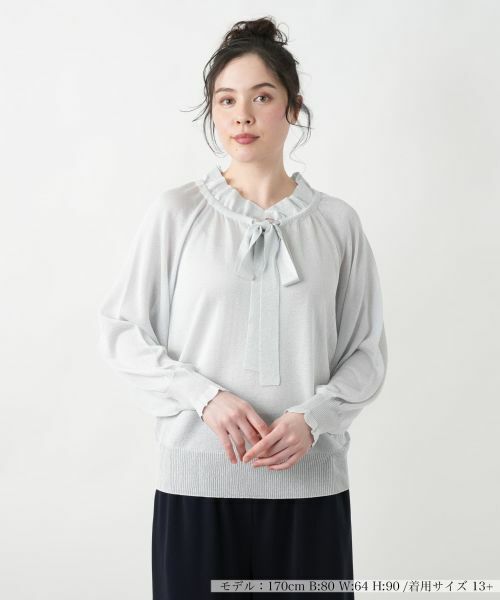 上品なラメ感が華やかさをプラスするリボンタイ付きニットプルオーバー。デコルテを美しく見せるラウンドネックに、ミニマルな衿とリボンディテールをあしらい、フェミニンな印象に仕上げました。柔らかなニット素材が心地よく体に馴染み、ゆったりとしたシルエットが女性らしさを引き立てます。袖口と裾はリブ仕様で、メリハリのあるデザインに。デイリーからオフィスシーンまで、幅広く活躍する一枚です。スカートと合わせてエレガントに、デニムと合わせてカジュアルダウンもおすすめ。