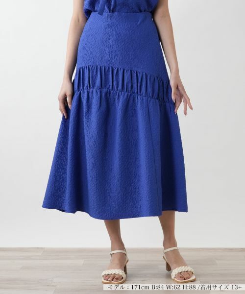 凹凸のある独特な表面感が特徴のロング丈フレアスカート。立体的なテクスチャーが生み出す陰影が奥行きを感じさせ、シンプルながらも存在感のある一枚に仕上げました。部分的に切り替えを施し、ギャザーを寄せることで動きのある表情をプラス。バックウエストはゴム仕様で心地よくフィットし、歩くたびに揺れる軽やかなシルエットが、エレガントな雰囲気を引き立てます。サイドホック&ファスナーにより開閉が可能。セットアップ対応可。