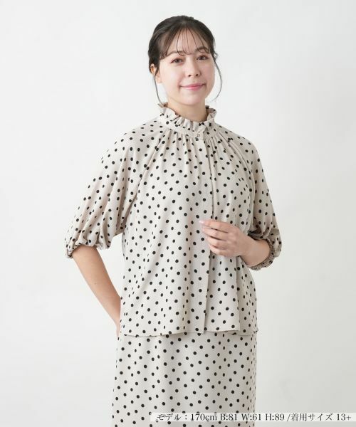 クラシカルなドット柄が華やかさを添える、エレガントなハイネックブラウス。ギャザーをたっぷりと寄せたスタンドフリルが、顔まわりを優しく彩り、洗練された印象を演出します。袖口にゴムを入れたふんわりとしたボリュームスリーブが女性らしいシルエットを引き立て、程よいリラックス感をプラス。フロントは比翼ボタンですっきりとまとめました。さらりとした風合いで着心地も良く、オンオフ問わず幅広いシーンで活躍します。シンプルなボトムと合わせるだけで、大人の品格漂うコーディネートが完成する一枚です。