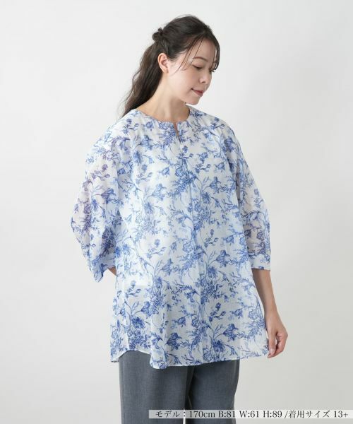 水彩画のように柔らかく描かれたフラワー柄のプリントが、目を惹く存在感を放つブラウス。キーネックが、顔まわりにさりげない抜け感を演出。ドロップショルダーとボリューム感のあるシルエットがリラクシーな大人の余裕を感じさせます。後ろ裾は少し長めに仕立てており、ヒップラインを自然にカバーしながら、動きに合わせて軽やかに揺れる表情も魅力です。さらりと着るだけでサマになる、日常にアートな彩りを添える一枚。