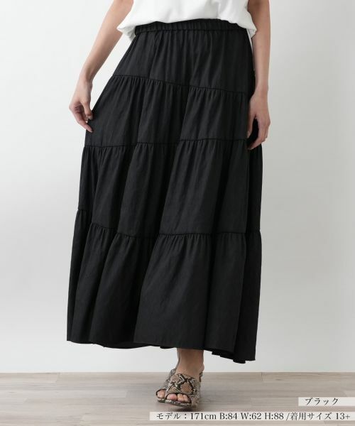 ティアードデザインが織りなす、ボリューム感溢れるシルエットが歩くたびにフェミニンな華やぎを演出するロングスカート。ウエストはストレスフリーな総ゴム仕様で腰まわりにやさしくフィット。落ち着いたシックな色合いでコーディネートしやすく、トップスをインすれば自然とスタイルアップ見せも叶います。落ち感がきれいなさらっとした肌触りのポリエステルを使用しており、シーズンムードにぴったりな一枚です。