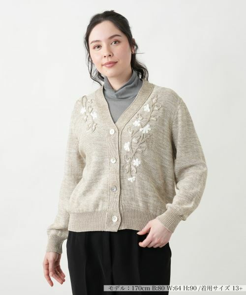 フロントにあしらわれたフラワー刺繍が、フェミニンなエッセンスを添えるVネックカーディガン。シンプルながらも存在感のある一枚に仕上げました。ネックのすっきりとしたデザインが顔周りをシャープに見せつつ、絶妙な抜け感をプラス。丈感も計算されており、カジュアルなパンツにもフェミニンなスカートにもバランスよく馴染むシルエットもポイント。デイリーにはもちろん、ちょっとしたお出かけやオフィスシーンでも活躍する、着回し力の高いトップスです。