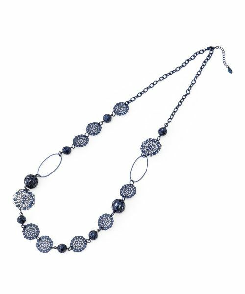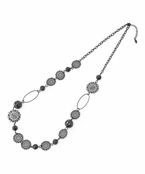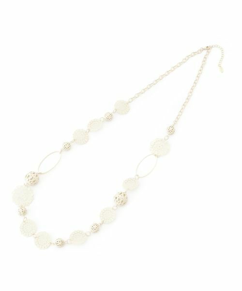 レースのような繊細なモチーフやサークルパーツがあしらわれた、アンティーク調のロングネックレス。多彩な表情のパーツがリズミカルに連なり、シンプルな装いにも印象的なアクセントを添えてくれる一本です。クラフト感のあるデザインでノスタルジックな雰囲気も漂い、これからの季節らしいニュアンスに。カジュアルなカットソーにも、フェミニンなブラウスにも自然となじみ、コーディネートに存在感をプラスします。