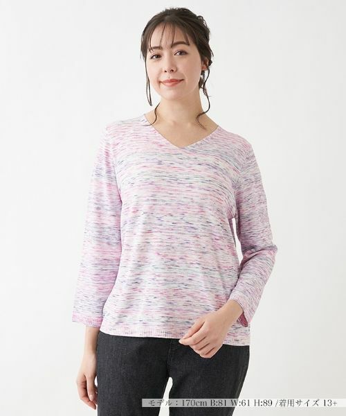 表情豊かなメランジ調の素材にマルチカラーを取り入れたVネックトップスです。ベーシックなシルエットで着やすく、コーディネートにインパクトをプラスできる1枚。カジュアルなボトムスと合わせるのがオススメです。※定価(税込)は、2022年06月29日のセール開始前の店舗における販売価格です。家庭洗濯不可漂白不可タンブル乾燥不可アイロン低温160℃まで石油系溶剤ドライクリーニング弱ウェットクリーニング不可