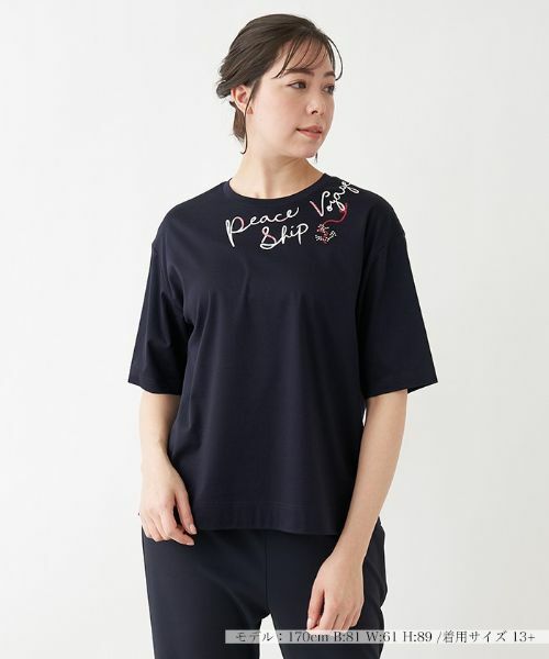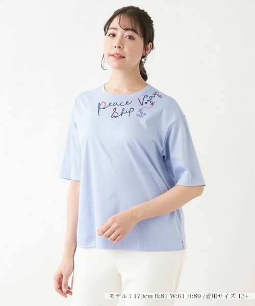 落書きのようなタッチのロゴプリントを首元に沿うようにあしらった半袖Tシャツ。ロープのイラストの先端には、キラキラと輝くラインストーンでイカリマークをオン。爽やかさとさりげないリッチさを持ち合わせた、大人カジュアルにオススメの1枚。