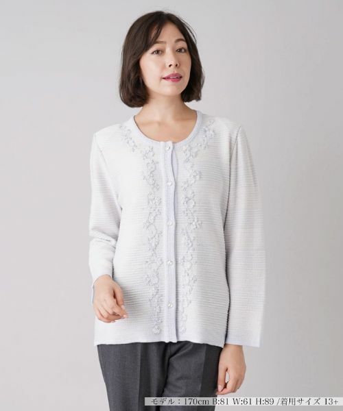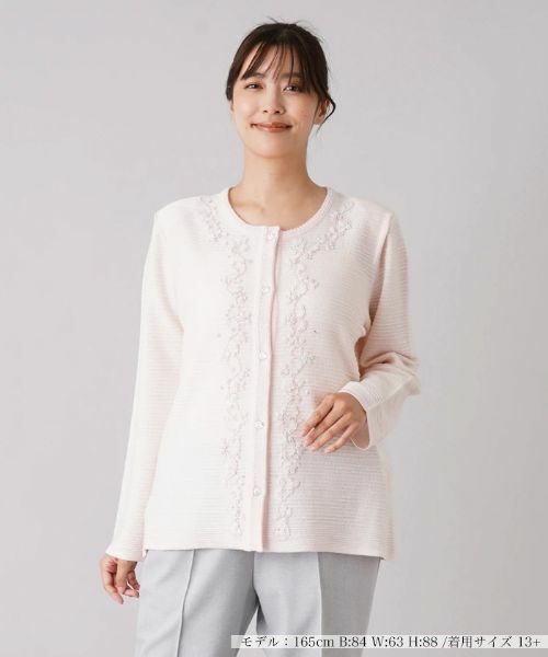 素材をざっくりと編み込んだ、すっきりとしたシルエットのクルーネックカーディガン。ネック周りからフロント、裾にかけて施したフラワー刺繍やビーズ使い、ビジューボタンが華やかなエッセンスに。カットソーとのレイヤードスタイルやロングスカートともコーディネートしやすく、ワンランク上のエレガントなフェミニンルックが楽しめるアイテムです。