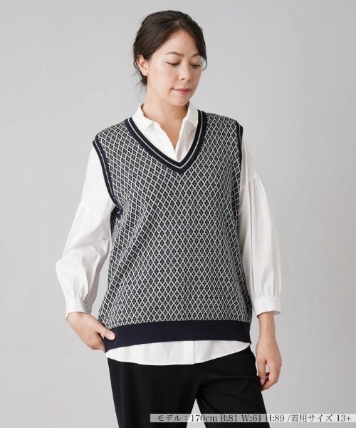 トレンドの幾何調ジャカードのニットベストを大人っぽいゆとり感と素材でアレンジ。