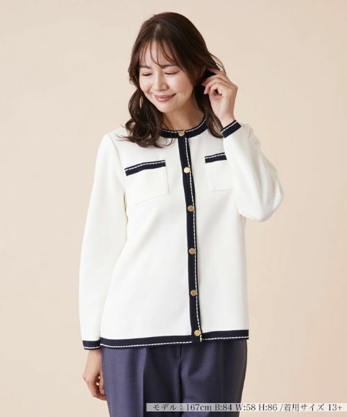 アウトラインの配色トリミングやステッチワークが独特の表情を作り出すクルーネックカーディガン。きらりと光るゴールドボタンも絶妙なアクセントに。シルエットには程よくゆとりをもたせつつも、すっきりとバランスよくまとめています。コーディネートするボトムスを選ばず、気軽に着こなしやすくなっています。