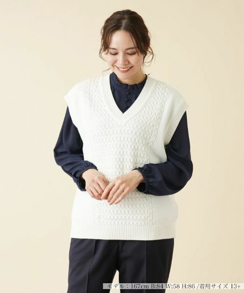 一点投入でトレンド感が高まる、Vネックニットベスト。フロント部分には細やかな柄編みを施しており、上品さと清潔感を忘れないお洒落なスタイリングが楽しめます。すっきりとしたシルエットで着こなしやすく、お手持ちのシャツやカットソー、ワンピースとのレイヤードもバランスよく仕上がります。