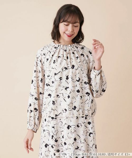 京都でプリントされた線描き風のフラワープリントが印象的なスモックブラウスです。2WAYストレッチで程よい落ち感とドレープ性に優れた素材を使用し、柔らかな表情を作り出しています。袖をラグランスリーブで仕上げ、襟ぐりと裾にゴムを入れることで快適な着用感を実現しました。これからの季節にぴったりなフェミニンルックが完成するアイテムとなっています。カフスボタンは開閉可。