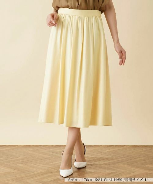 シルキーな光沢感のある素材を使用したミディ丈のフレアスカート。ウエストをシェイプしつつ、裾に向かって広がりをもたせたシルエットがエレガントな女性らしさを引き立てます。ギャザーをたっぷりと施し、柔らかなニュアンスに仕上げました。バックウエストはゴム仕様で心地よいフィット感をもたせています。シンプルなトップスを合わせるだけで、旬のフェミニンルックが完成します。サイドホック&ファスナー開閉可能。