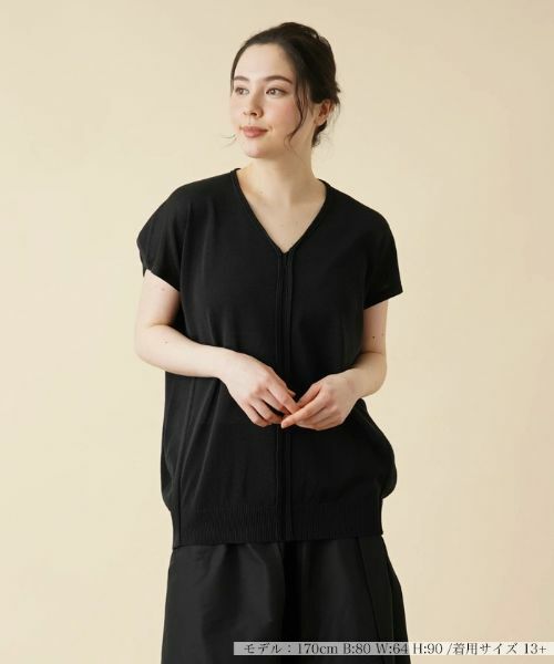 コットンベースのシアーニットでデザインした、清涼感溢れるVネックプルオーバー。ワイドに開いたネックラインがデコルテを覗かせ、絶妙な抜け感を作り出しています。肩をちょこんと覆うようなスリーブ、フロントやバックの切り替えなど、シンプルで終わらないさりげないディテールがこだわりを感じさせます。すっきりとしたボトムスでまとめると好バランスのコーディネートに。