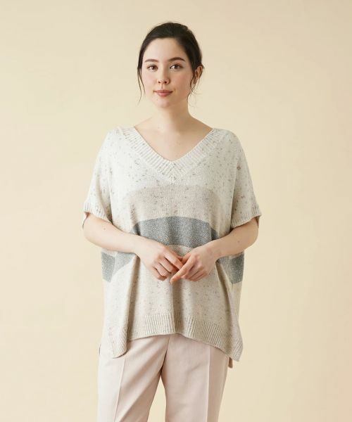 前後に大きく開いたワイドVネックと緩めのスリーブライン、裾に入れた深めのサイドスリットが抜け感のあるシルエットを作り出すニットベスト。身頃中央に配したボーダーラインがインパクトを放ち、全体に散りばめられたラメの煌めきがさりげなくラグジュアリーな雰囲気を演出。ボリューミーなワイドパンツやフレアスカートを合わせたフェミニンルックもひと味違った印象に仕上がります。