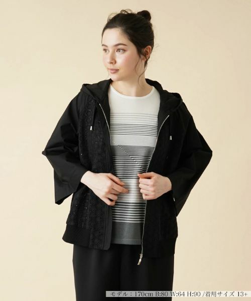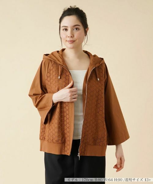 エキゾチックな趣のサークルレースで切り替えたフーデッドジャケット。さらりとした爽やかな風合いのコットン生地を使用し、快適な着心地を叶えました。比翼仕立てのフロントはファスナー仕様でスムーズに着脱可能。バックは大きめのフードがインパクトを放ち、フードはドローコードにより調整できます。緩めのシルエットでこなれ感たっぷりのスタイリングが楽しめます。