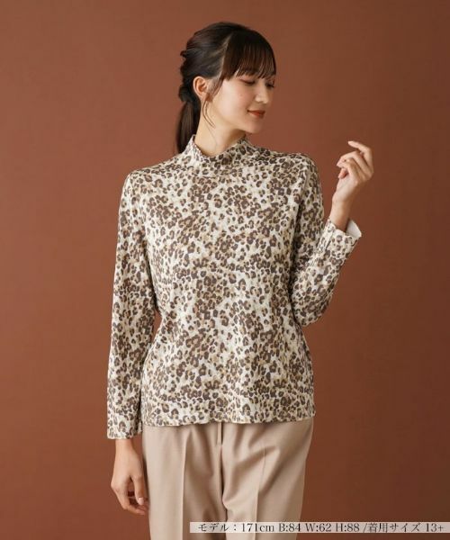 旬のサファリテイストが薫るレオパード柄のハイネックカットソー。デコルテをさりげなくカバーするデザインで、シルクやカシミヤをブレンドした温かみのある上質なテキスタイルが肌に優しく寄り添います。コンパクトなシルエットでもたつかず、一枚での着こなしはもちろん、ジャケットやカーディガンとのレイヤードスタイルでも活躍間違いなしのアイテムです。